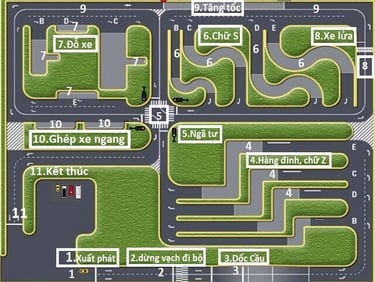 Hơn thế, điều này còn giúp xe dừng đúng chỗ, dừng đúng thời điểm như phần thi dừng xe cho người đi bộ, trước đường sắt hay đoạn lên dốc. Dưới đây là tổng hợp của 11 bài thi sa hình bằng lái xe ô tô B2: